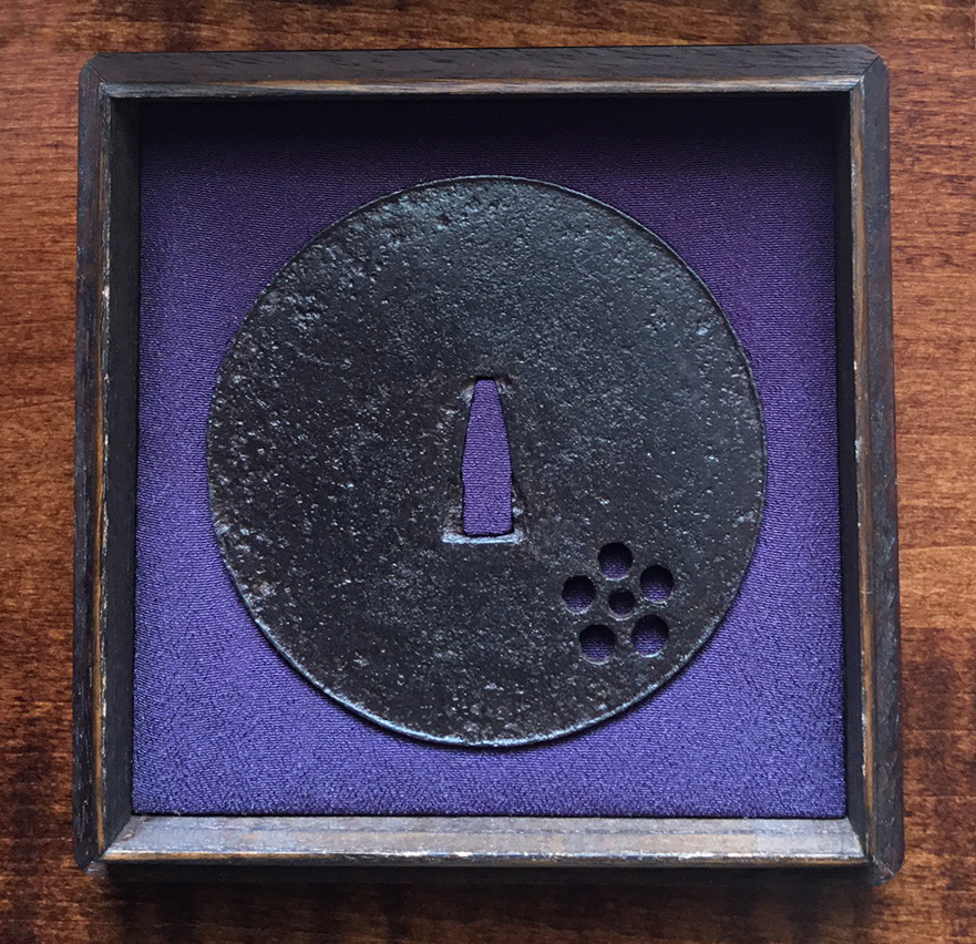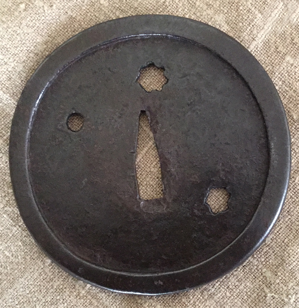 This Ubu plate is in pristine condition with the raised rounded rim as well as the surface carefully worked and finished. Both sides are equally well preserved, displaying even patina and very faint indication of mounting at the seppa-dai. A closely fitted copper insert (sekigane) fills out the nakago-ana. The absence of sukashi underscores the near perfect symmetry of the plate, which is convincing without decoration, creating a strong impression of a functionally designed guard for the sword.it was produced to accompany; in this case perhaps one of substantial size. Ko-Katchushi — 'San Ko' sukashi Hand work can be seen on this sword guard, from the uneven circumference of the iron plate to the rounded edges of the noticeably flattened rim. The surface displays deep coloration revealing traces of lacquer and the sukashi, which represents '3 sources of light,' is archaic in execution. The placement of the open work completes the overall look of antiquity in this early Muromachi. Ko-Katchushi.