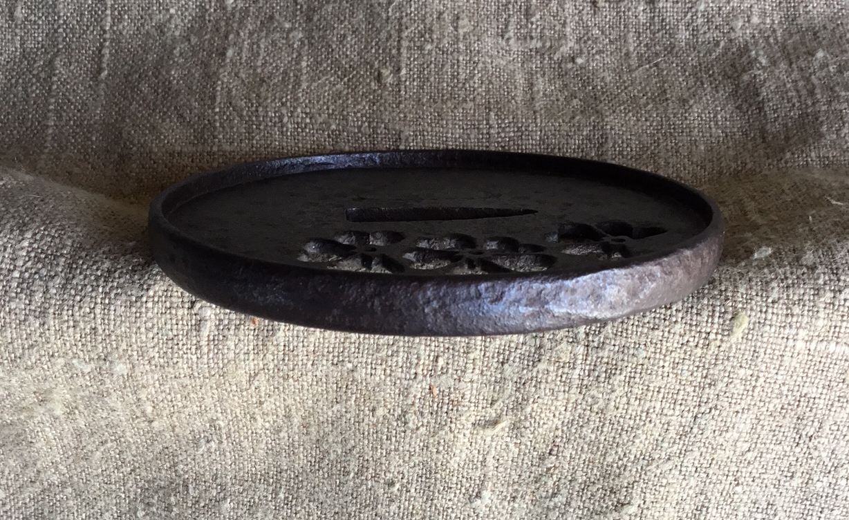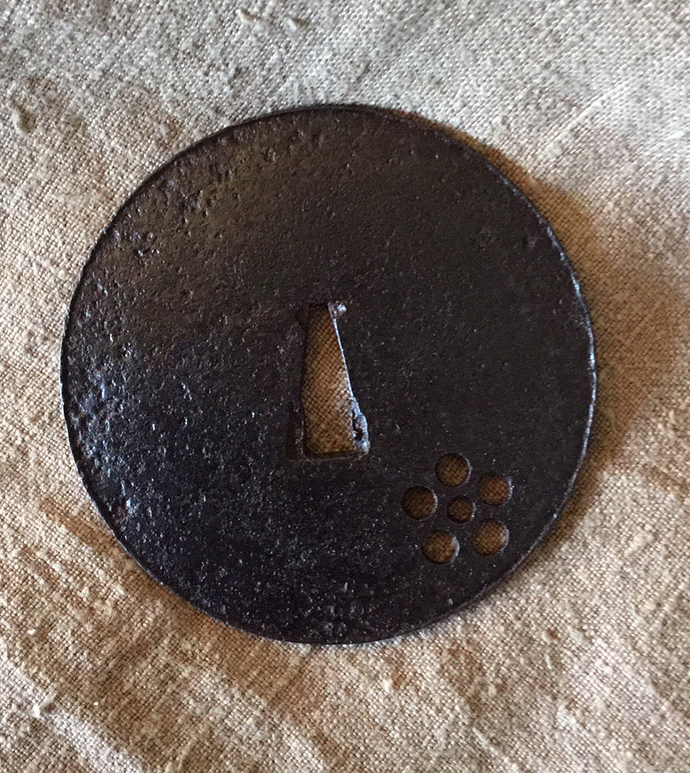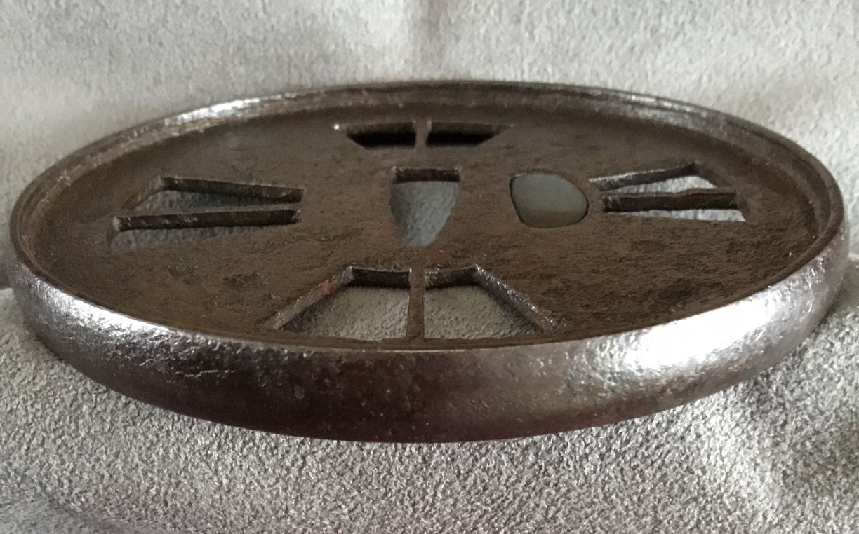 One characteristic of Katchushi distinguishing it from Tosho production is the departure from a flat rim in their tsuba, which in most cases is a defining singularity. As the surface of the plate often appears similar between early examples of the Tosho and Katchushi, making a judgement on that basis alone is challenging. The traditional distinction(s) documented and passed along down to the present day emphasize the rim as an indication of a different style, if not higher skill level. The tsuba imaged here have varying rim types, beginning with the beveled edge, which is evident on the first Katchushi guard pictured in this selection. Ko-Katchushi — Plum sukashi — Muromachi era