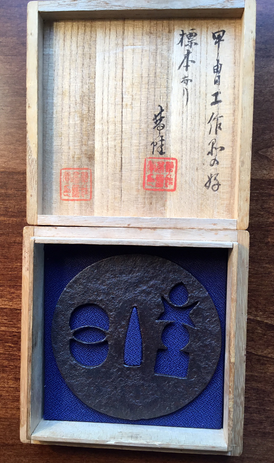 Gorintou (stone burial marker) and Wachigai (interlocking or overlapping rings) comprise the design on this tsuba. The sukashi shows more styling than the traditional Ko-Tosho decorative openings, as well as being large and expansive on the plate and although forged with a flat rim, the addition of a more stylized motif, marks another telling distinction between the two schools. This example is a flawlessly executed mid-Muromachi era masterpiece classified as Ko-Katchushi. The tsuba has provenance and reflects classic samurai austerity and symbolism. The custom box has a Hako-Gaki by Kuwabara Yojiro and was published in Tsuba no Bukashi-1969. Ko-Katchushi — Ubu — Muromachi