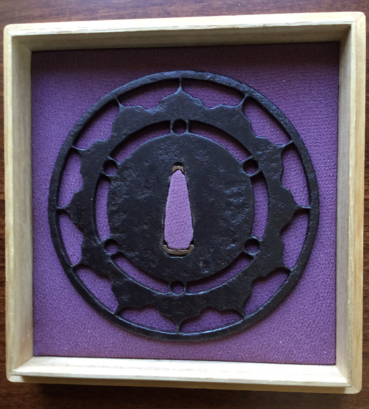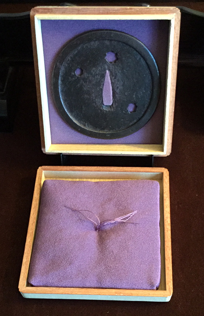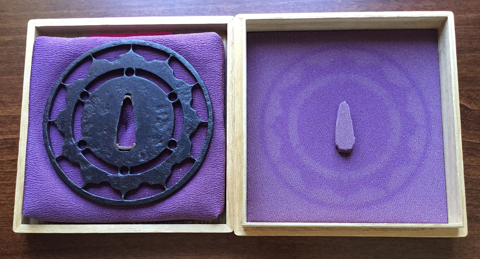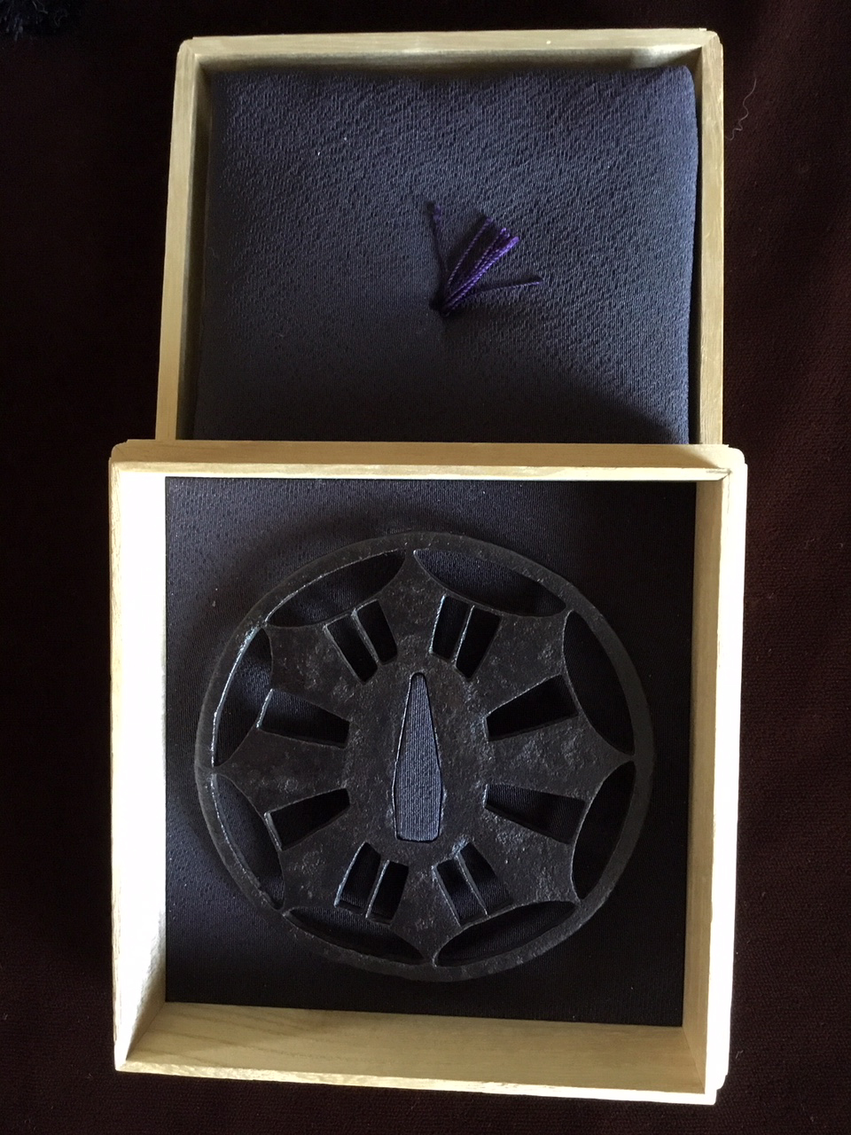 Rinpo sukashi of this period are classified as 'Katchushi' rather than Tosho, in part due to the extensive openings on the plate, notwithstanding the presence of a flat rim on the tsuba. Rinpo-sukashi are designed with the wheel motif, the configuration dating back to the Heian period in one form or another. This symmetrically balanced example of the 'wheel' is carefully cut into the plate with an outer and inner ring; the outermost connecting the rim to the inner ring by 12 spokes, which may represent "twelve links of dependent origination". The inner ring in turn, is joined to the plate at the seppa-dai. A close examination of the tsuba will reveal tekkotsu on the rim as well as signs of period corrosion consummate with its age on the surface of the plate. I have included an image of the box which reveals the imprint of the tsuba outline, as it is valued by some collectors because it relates to the length of time the box and tsuba have been together. Another purely conjectural point of interest that may suggest how the tsuba is held in esteem, is the construction of the custom box and the color purple in the box lining and the pillow; being consistent with many of the tsuba of high grade that I have come across.