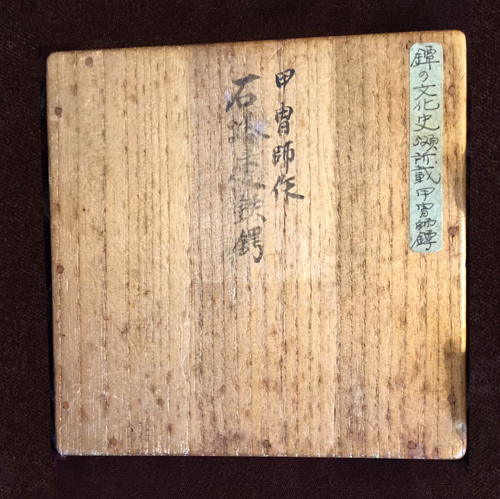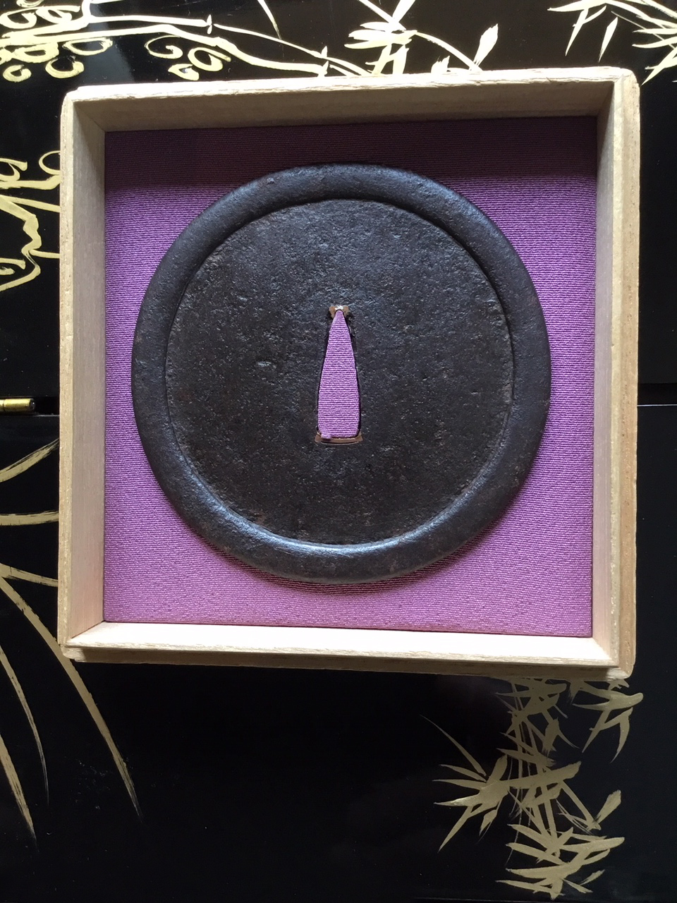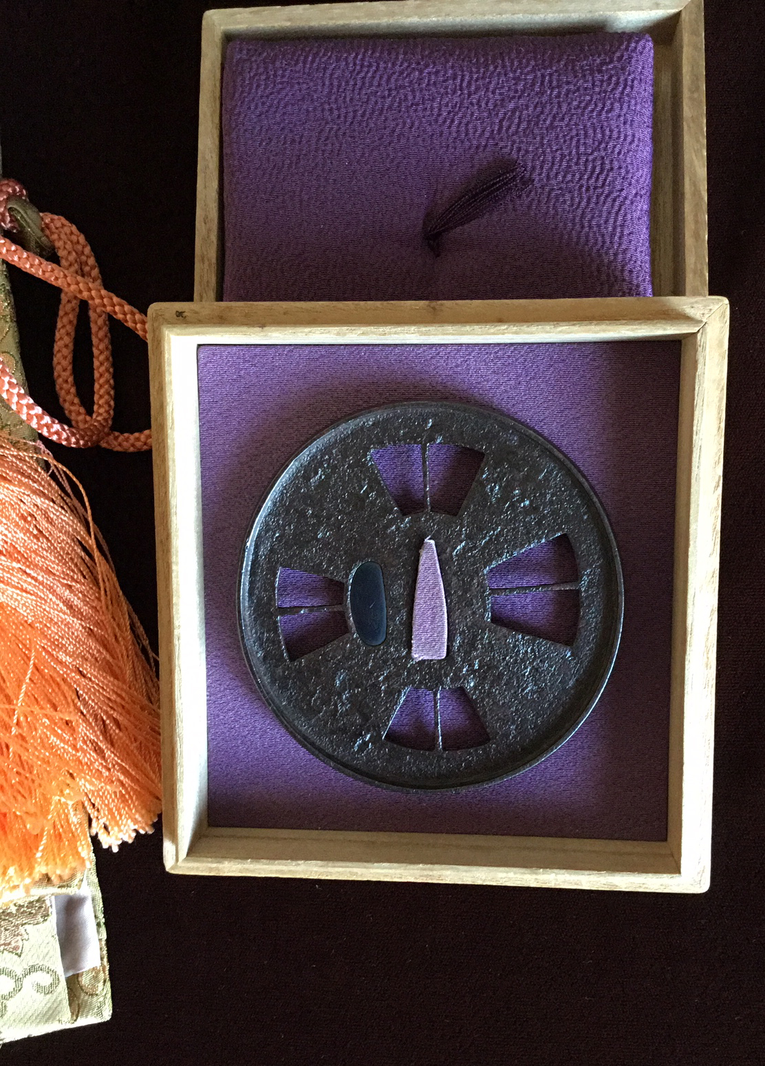 Rinpo sukashi of this period are classified as 'Katchushi' rather than Tosho, in part due to the extensive openings on the plate, notwithstanding the presence of a flat rim on the tsuba. Rinpo-sukashi are designed with the wheel motif, the configuration dating back to the Heian period in one form or another. This symmetrically balanced example of the 'wheel' is carefully cut into the plate with an outer and inner ring; the outermost connecting the rim to the inner ring by 12 spokes, which may represent "twelve links of dependent origination". The inner ring in turn, is joined to the plate at the seppa-dai. A close examination of the tsuba will reveal tekkotsu on the rim as well as signs of period corrosion consummate with its age on the surface of the plate. I have included an image of the box which reveals the imprint of the tsuba outline, as it is valued by some collectors because it relates to the length of time the box and tsuba have been together. Another purely conjectural point of interest that may suggest how the tsuba is held in esteem, is the construction of the custom box and the color purple in the box lining and the pillow; being consistent with many of the tsuba of high grade that I have come across.
