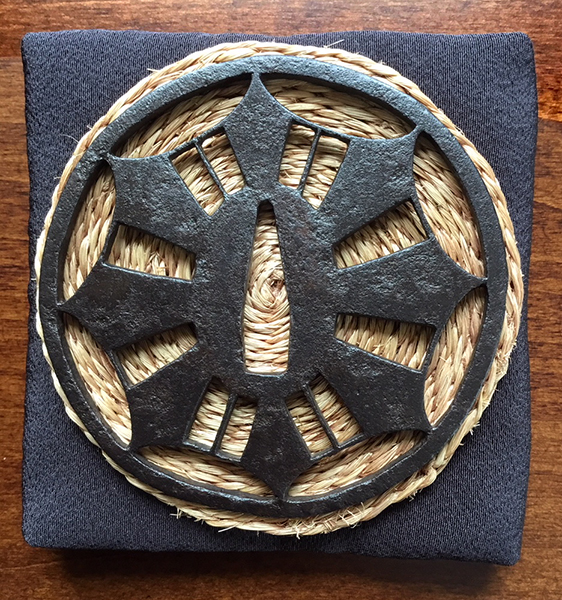 Rinpo sukashi — 'Wheel and Sun Rays' H/W 8.9 x 9.0 cm — Rim 3 mm — Mid-Muromachi An eight-spoke wheel connects the rim to the plate in this stunningly designed Katchushi. The 'spokes', which symbolize the 'eight-fold path', radiate from the plate forming eight repetitive semi-circular openings and sun ray sukashi arranged around the nakago-ana. The tsuba is ubu with no openings for hitsu-ana and is well balanced in design. The surface has perfect coloration and patina, the quality of iron is excellent and the sukashi is bold and archaic in appearance. |