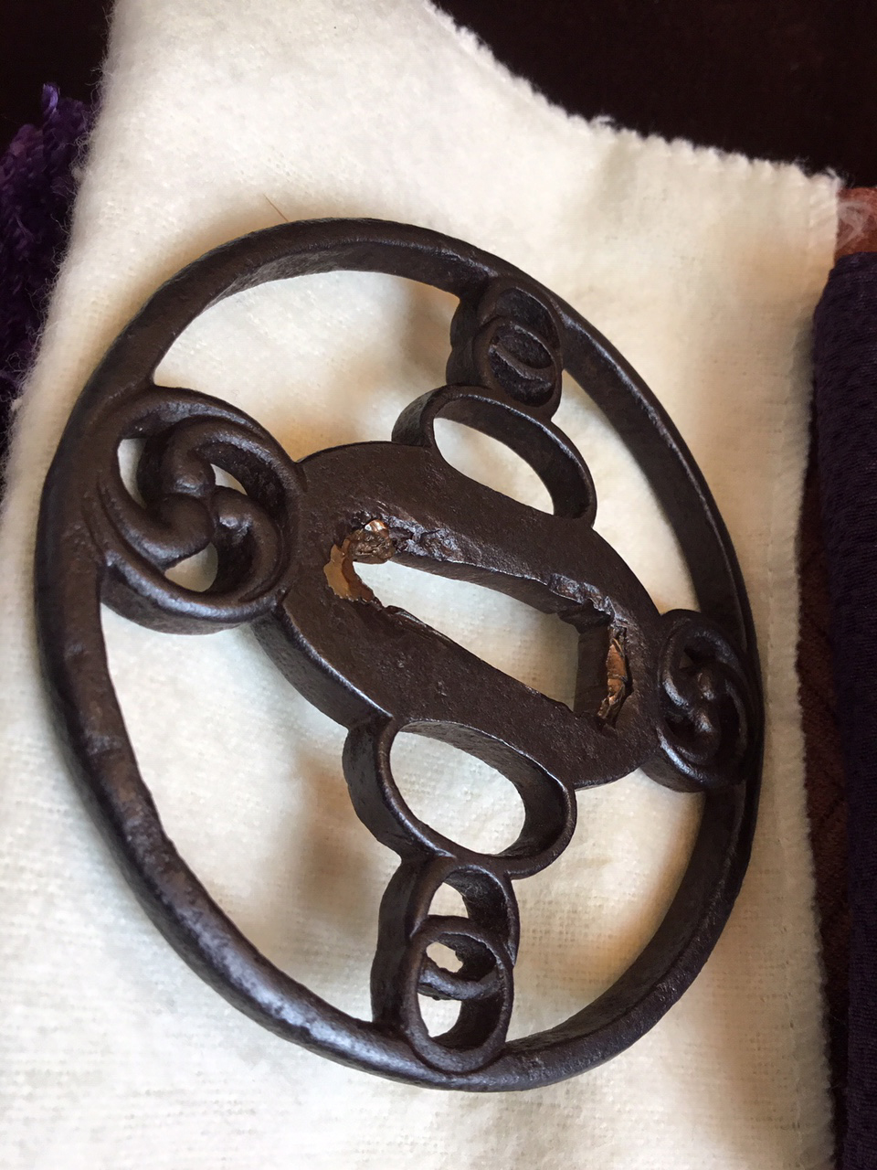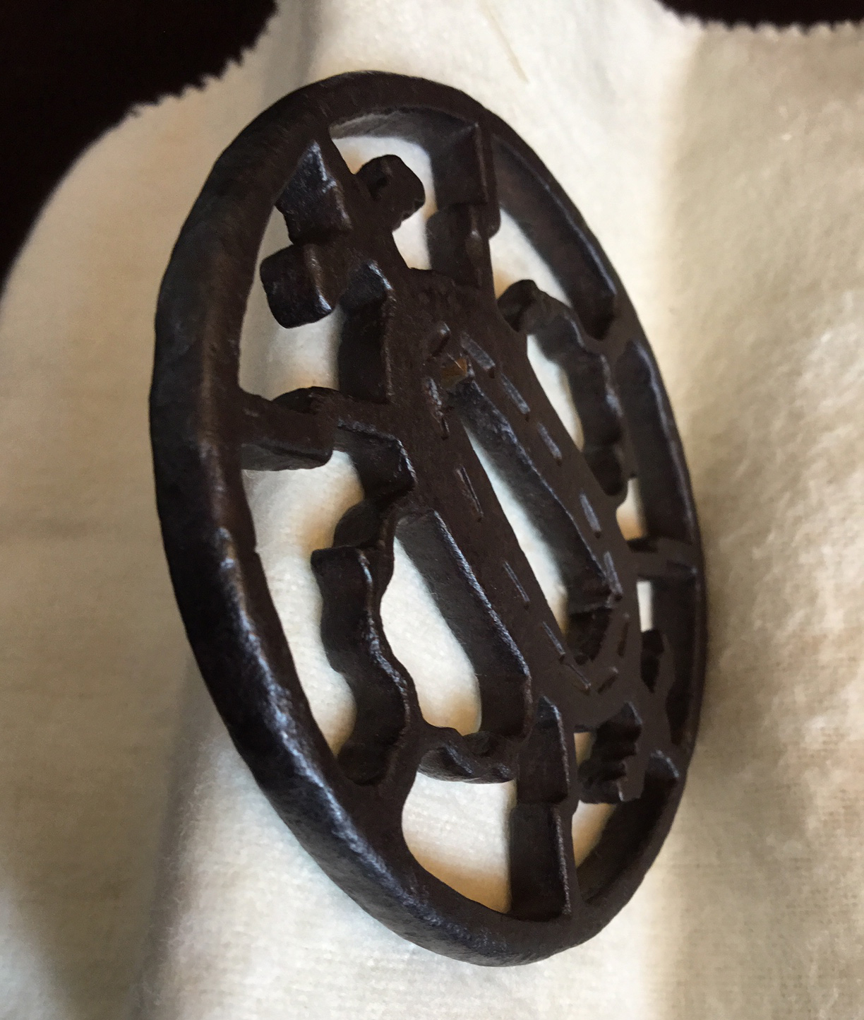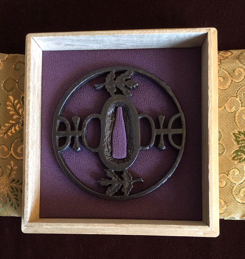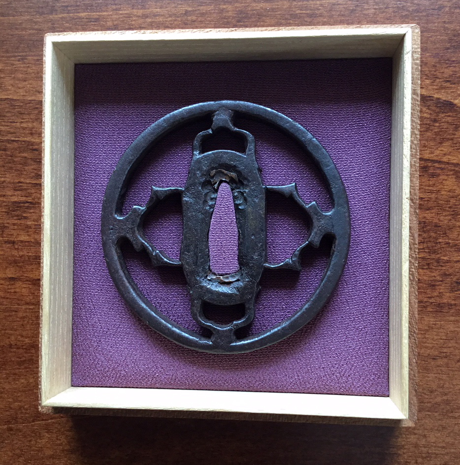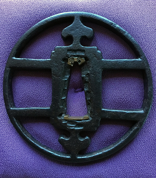 This example dates to the early Muromachi period and closely resembles a sword guard presented by SASANO in his publication Japanese Sword Guard Masterpieces Part One, page 60. The sukashi is identified as 'Mitsu domo' (coma) at the top and bottom and Watchigai (interlocking rings) joining the rim to the hitsu-ana. The style of hitsu-ana being long and round, or half moon in shape are characteristic of early production. This tsuba shows a well-balanced design and is in a wonderful state of preservation with uniform deep color and depth of patina. The quality of iron appears to be excellent. H/W 7.6 x 7.5 cm — Rim 5 mm — Early Muromachi Kyo-sukashi — 'Kaji-Kichi’' sukashi