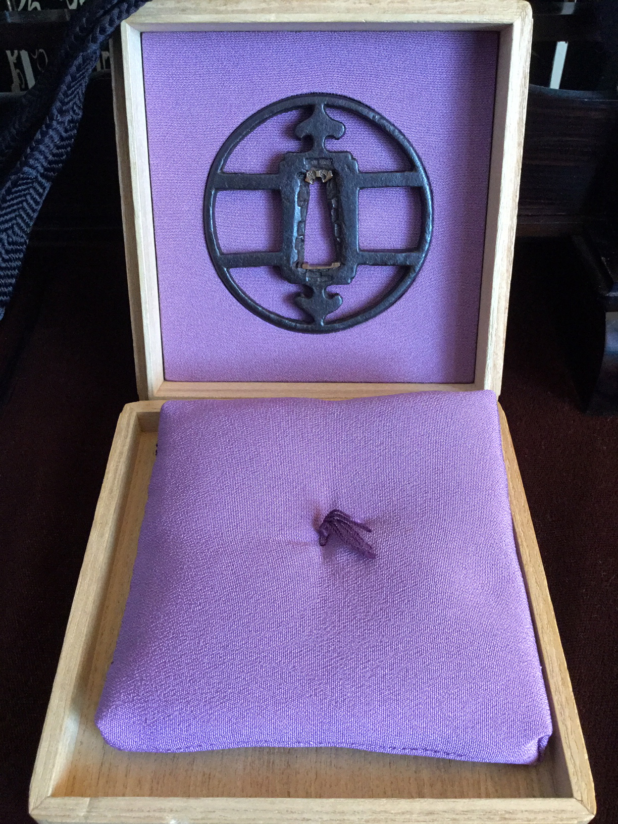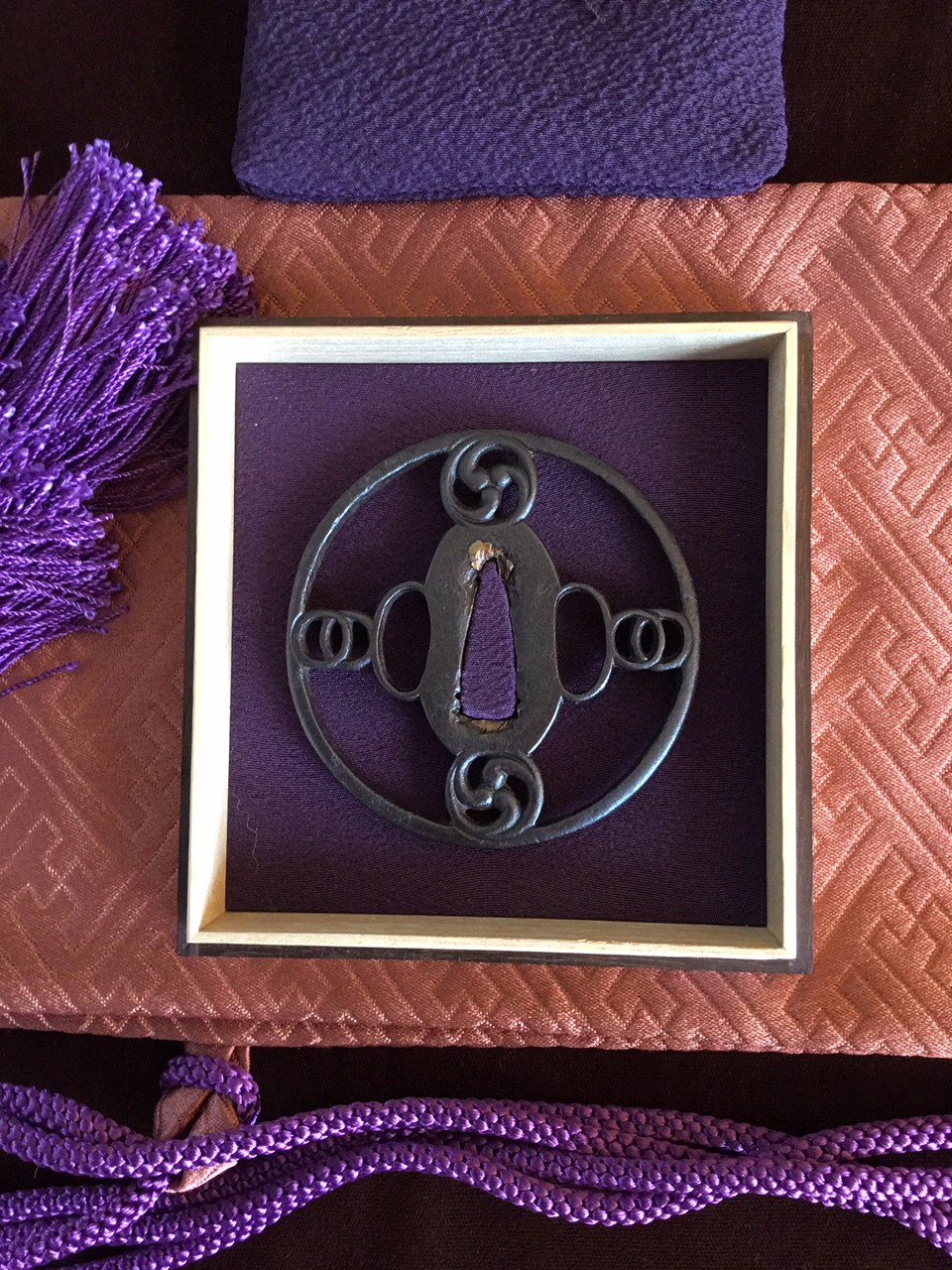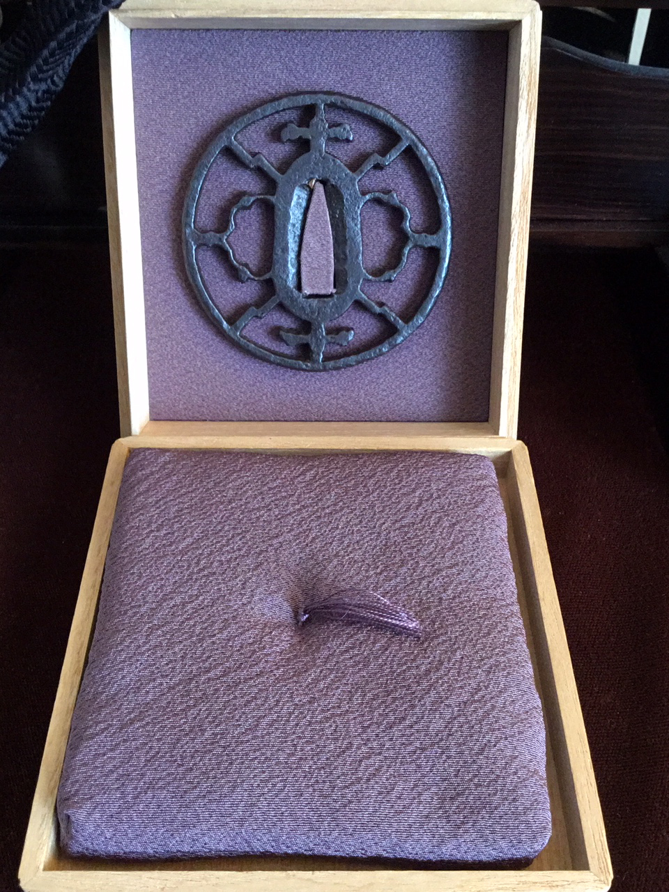 This example dates to the early Muromachi period and closely resembles a sword guard presented by SASANO in his publication Japanese Sword Guard Masterpieces Part One, page 60. The sukashi is identified as 'Mitsu domo' (coma) at the top and bottom and Watchigai (interlocking rings) joining the rim to the hitsu-ana. The style of hitsu-ana being long and round, or half moon in shape are characteristic of early production. This tsuba shows a well-balanced design and is in a wonderful state of preservation with uniform deep color and depth of patina. The quality of iron appears to be excellent. H/W 7.6 x 7.5 cm — Rim 5 mm — Early Muromachi Kyo-sukashi — 'Kaji-Kichi’' sukashi