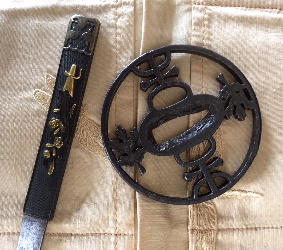 The design on this Kanayama tsuba translates to double crossbars in ancient Japanese. The vertical bars represent an early Kirimon Kamon of the Samurai family who owned it. The crossbar design in general is said to be a conventionalism of a Dragon (Ryu). There is also a reference in Sasano, relating to the Ashikaga family, rulers of Japan and Shoguns, and their adaption of the design on their Mon. Tekkotsu is in evidence on the plate and abundant on the rim of this tsuba. The design is balanced and engaging, while close examination reveals a mon of the 'Satake-Daimyo' distinctly visible (with magnification) on the copper insert at the top of the nakago-ana. Kanayama — "Kiri Karigane Kagi" sukashi — Momoyama H/W 7.0 x 6.9 cm — Rim 5.3 mm — Momoyama Wild geese and thunderbolts constitute the design on this Momoyama period sword guard. Although many kamayama pieces continue to elude precise interpretation due to their abstract subjects, the sukashi on this tsuba is readily identified with and the pronounced tekkotsu on rim and surface stand out. The plate itself is perfectly balanced by the arrangement and is a beautiful example of Kanayama production, both well-crafted and in a fine state of preservation. Kanayama — "Bamboo and Ginger" sukashi