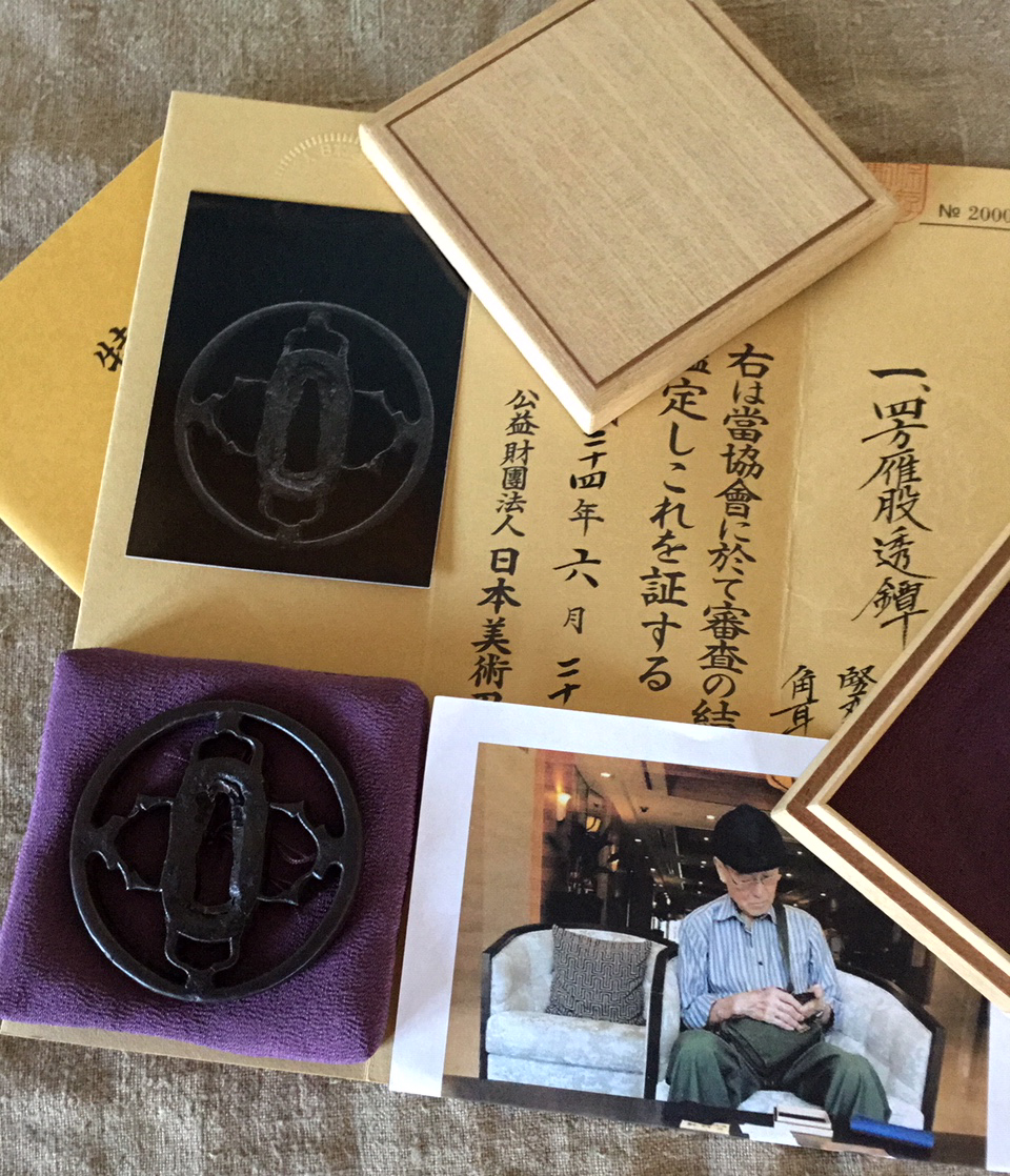 H/W 7.6 x 7.5 cm — Rim 5 mm — Momoyama Although the dimensions and even the design arrangement of this tsuba is almost identical to the previous 'Mitsu-domo’' image displayed, there are indications this piece was produced somewhat later. The iron has a beautiful luster and there appears significant tekkotsu visible on the rim, while the design features are identified as mulberry leaves, called 'Kaji' and the Japanese character 'Kichi' meaning lucky in English, that relate to the Tanabata festival, an annual celebration which draws its cultural connection from early times. A collector notation regarding the KANAYAMA pieces displayed herein; all examples imaged here have come to me directly or indirectly from private collection(s) and were purchased during recent years. It has been my experience tsuba of this grade have been exceedingly difficult to find in the past and are almost non-existent on the market today. The image below depicts Japanese sword and tsuba collector and Karate Master Abe Keigo. 'Kari Mata' Kanayama — Muromachi H/W 7.1 x 6.9 cm — Seppa 5.5 mm — Rim 7 mm The design at the top and bottom is of a 'spear head' which is remarkably like an early type of 'arrowhead' but larger in scale. The hitsu-ana are formed with 'wild geese' in flight, the latter a more common design in early pieces. This guard is typically small, compact and thick, while providing a sense of strength or power induced in part by the influence of the sukashi on the viewer. There is tekkotsu on the wide rim and an even patina commensurate with the age of the plate. Kanayama — 'Hikiryu' sukashi — Muromachi