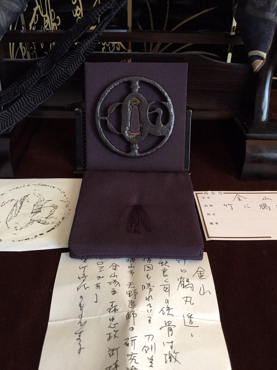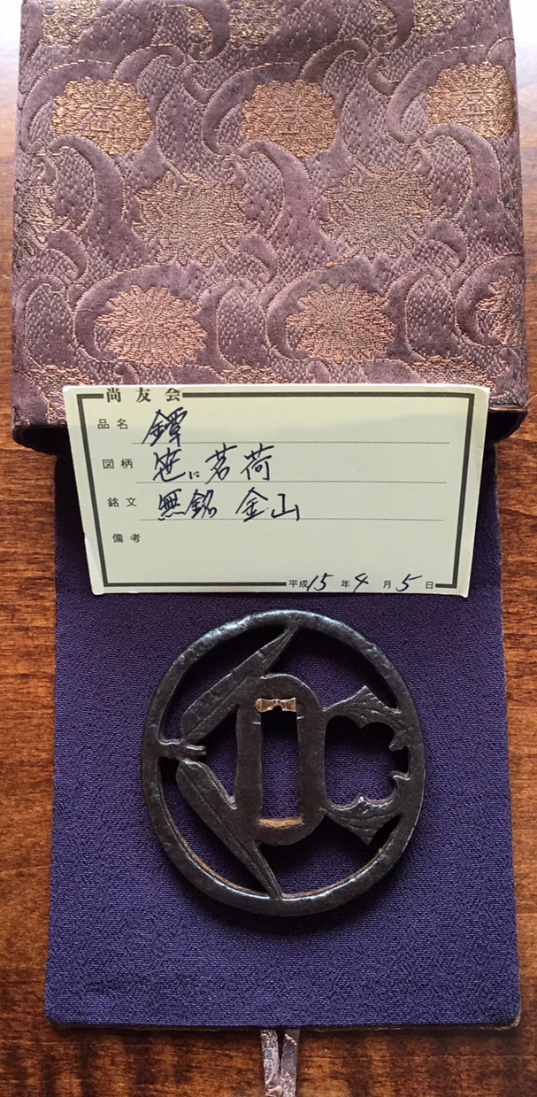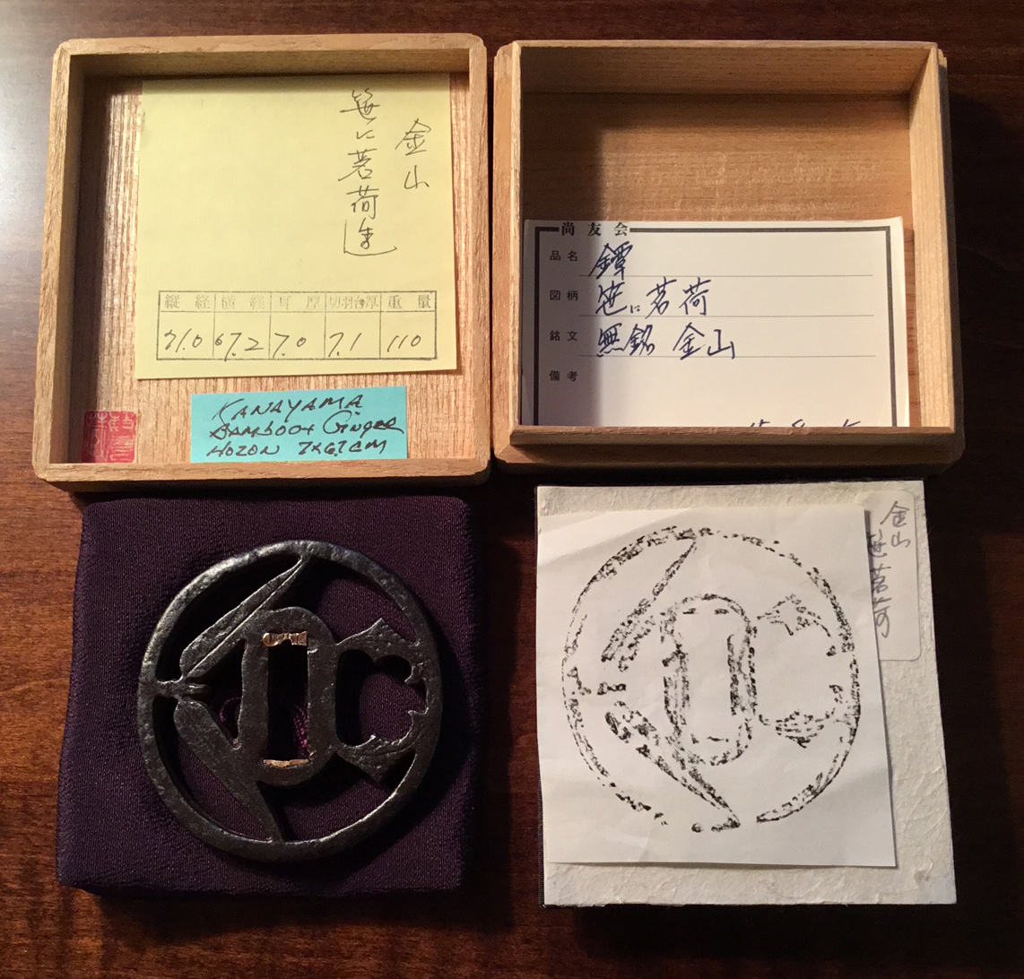 This tsuba shows excellent iron with depth of color and a lustrous surface. The rim is particularly impressive with lumpy granular 'iron bones' clearly visible on its sides as well as edges. Sasano in his previously referenced "Silver Edition," presents a remarkable likeness to this sword guard on page 172. Interestingly but not surprisingly, there are indications of Yagyu similarity, beginning with the iron color as well as the unusual rectangular shape of the nakago-ana, the bold design, the use of bamboo as a main motif and the thickness of the tsuba. References concede the production of these two schools are close in many aspects. Certification is to Kanayama.