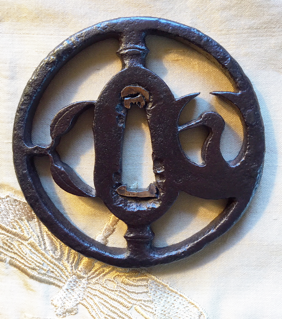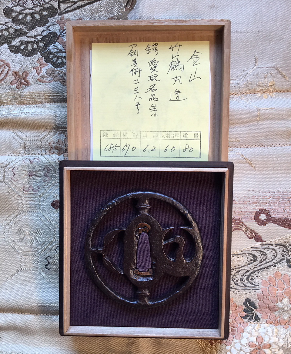 This tsuba exhibits many of the characteristics of this school in its size, excellent iron, patina of black purplish color and prominent abundant tekketsu. The design incorporates a 'crane' shrouded in its up-turned wings and 'bamboo leaves' positioned to form a hitsu-ana for kogai. The vertical posts appear to be abstract 'bamboo stems', all of which combine to present a peerless example of a classic Kanayama masterpiece of the Muromachi period. H/W 6.8 x 6.9 cm — Rim 6.0 mm — Late Muromachi |