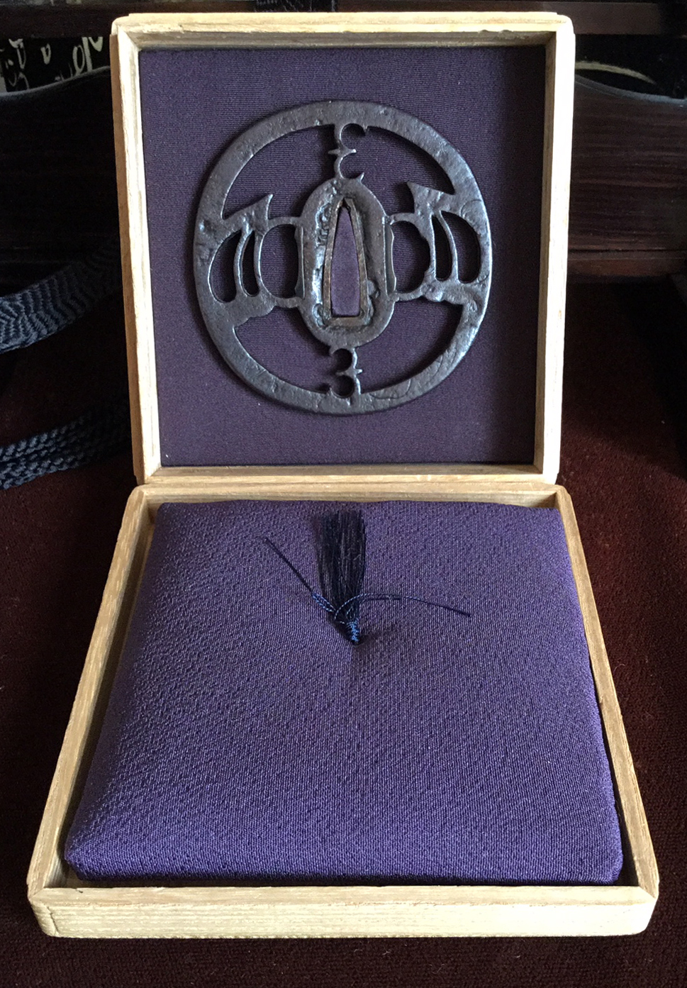 H/W 7.8 cm — Rim 5 mm — Muromachi The 'hira-ji' or plate surface on this tsuba is like the previous 'Geese in flight' sukashi and reveals a lustrous purplish black patina, prominent and conspicuous tsuchime-ji, granular tekkotsu on the rim and a wide seppa-dai that supports the distinctly powerful design of four pine trees (canopies); their towering height reflective in Samurai philosophy of 'strength of character' striven for by the warrior during that period. This tsuba design, its size and uniform balance is classically symbolic of the work of the Owari school.