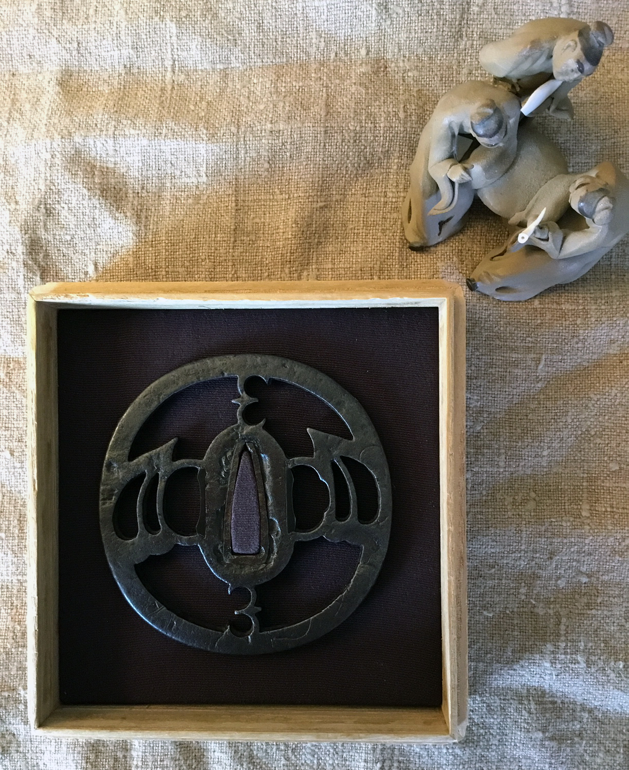 H/W 7.6 x 7.4 cm — Rim 5 mm — Muromachi Owari tsuba can be dated back to the mid-Muromachi period and were reportedly favored by Samurai during the ensuing 'Sengoku' period of continuous warfare. This piece appears to be from that era, its age in part evidenced by the uneven or irregular surface treatment on the face 'hira-ji' and the wide, squared rim framing it. The ji-sukashi connecting the rim to the seppa-dai (at the top and bottom) represent wild geese in flight, while the horizontal design is not readily identifiable. Owari tsuba of this vintage exhibiting well balanced sukashi, excellent iron quality, deep color and good state of preservation are considered very desirable.