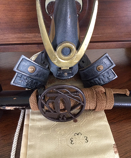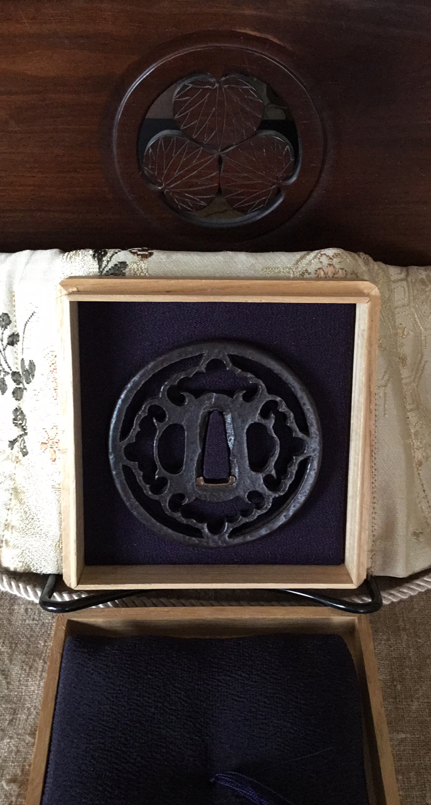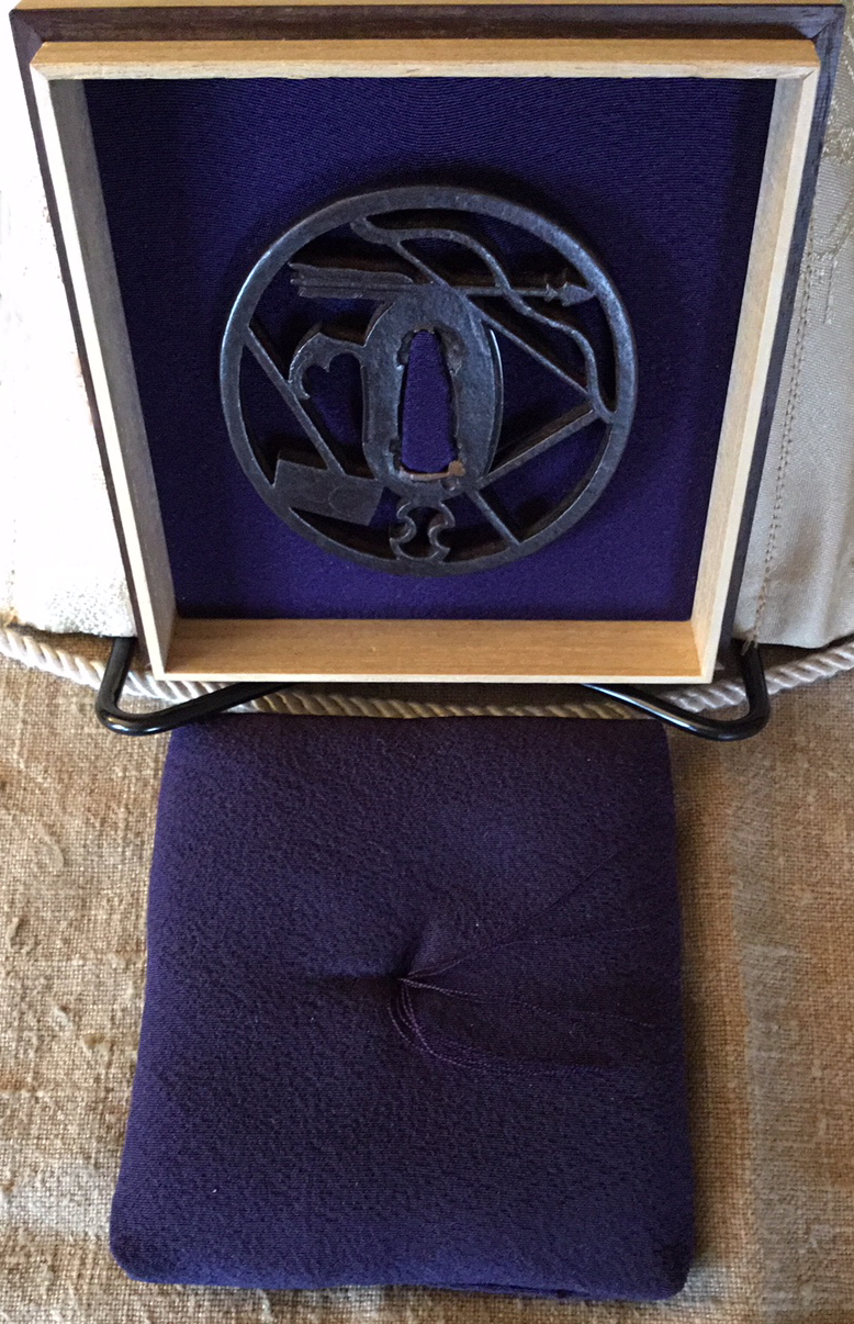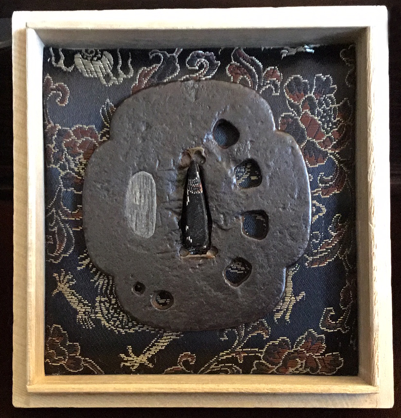 This tsuba is mokko-gata in shape with 'wheel' sukashi, 'udenuki-ana' and plugged hitsuana-ana; it is signed with the three-character signature 'Yamakichibee.' There are distinctions made with respect to signatures by this tsuba-maker and differing opinions as to generational identification in the Yamakichi line that followed, which will not to be examined here. In this case the signature has the appearance of the first generation (Shodai) and the tsuba is papered to Yamakichibee. The common characteristics relating to the shodai and identified in this piece include its granular surface, thickness and the reddish-purple color of the patinaed iron. Other relevant traits exhibited in the work are the mokko shape, wheel sukashi and 'iron bones' that stand out on the rim. In summary it is a nice representative piece and convincing in characteristics and attributes.