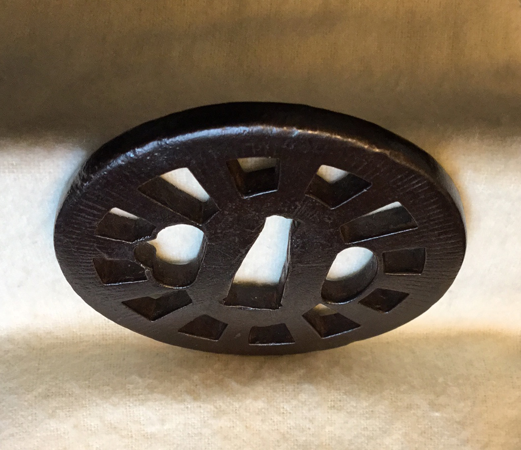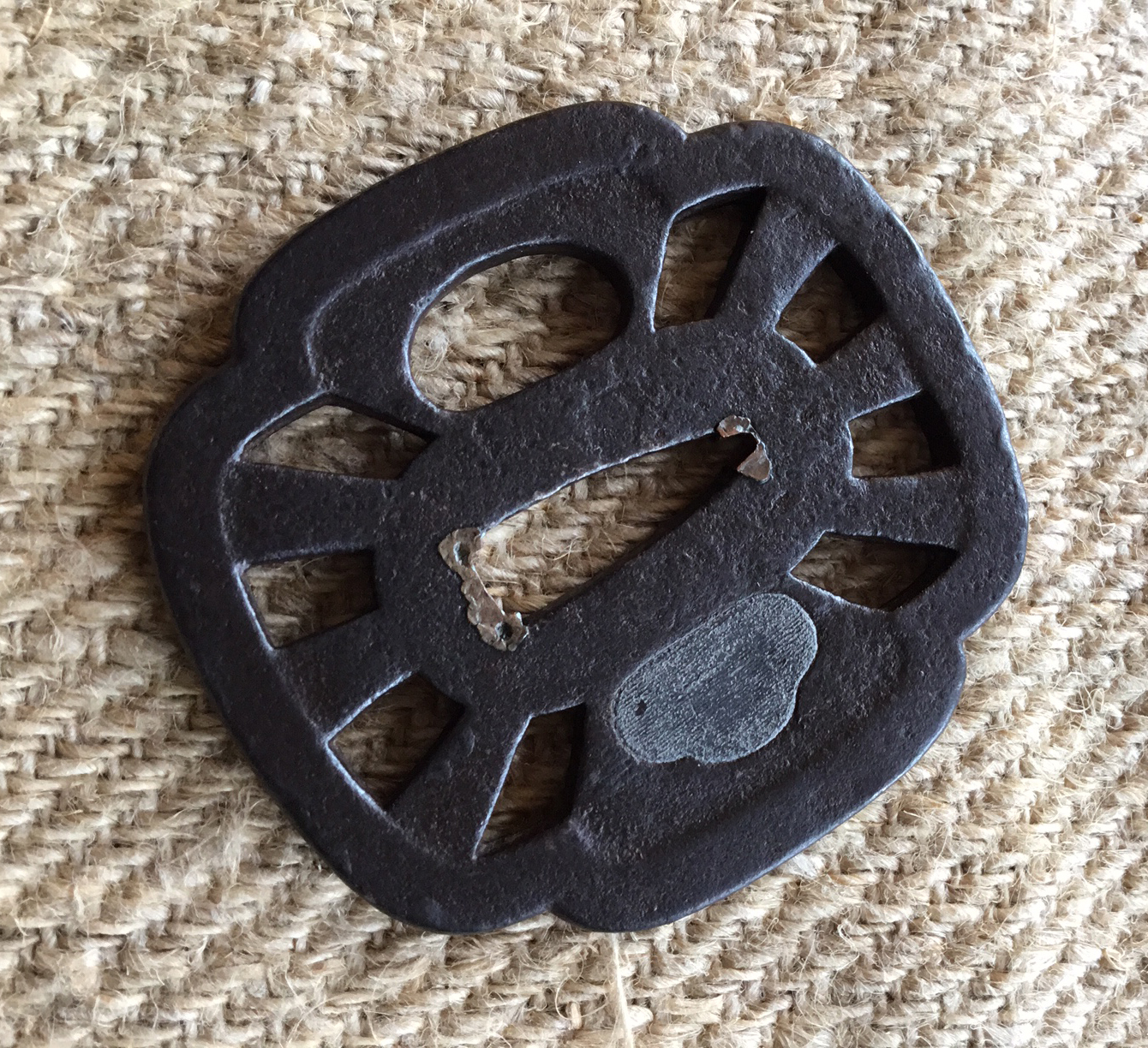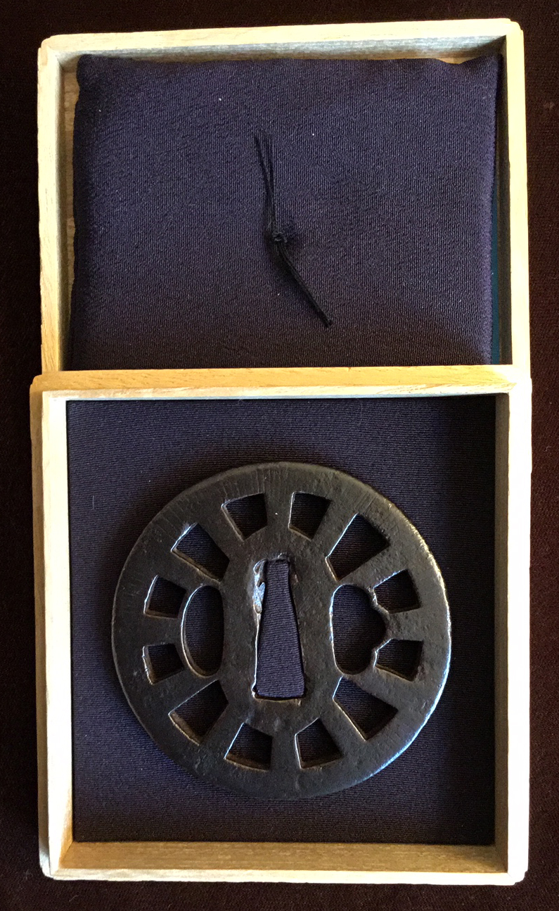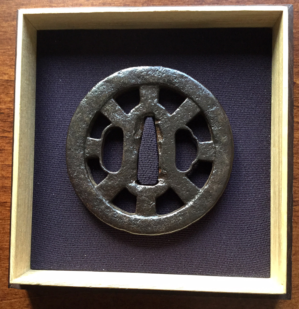 Yagyu — 'Kuruma sukashi' — Edo Period This is a convincing design with notable distinctions in the size of the wheel sukashi accommodating the hitsuana-ana and nakago-ana. Connecting the rim to the seppa-dai, are twelve spokes which form the wheel. Radial lines are visible on the wide rim edge which show wear, although they are more prominent on the reverse side and may relate to rays of the sun; an interpretation left to the viewer. The color of the iron, its thickness, the motif itself and the granular tekkotsu on the rim strongly indicate Yagyu production.