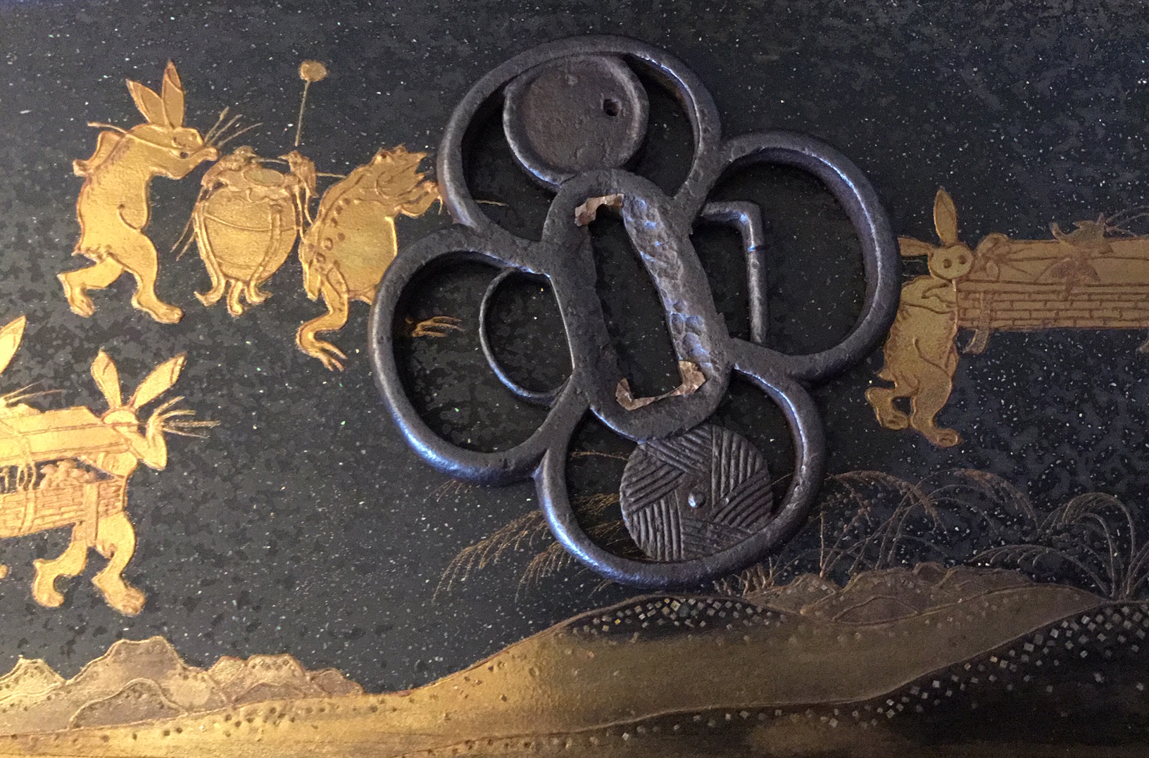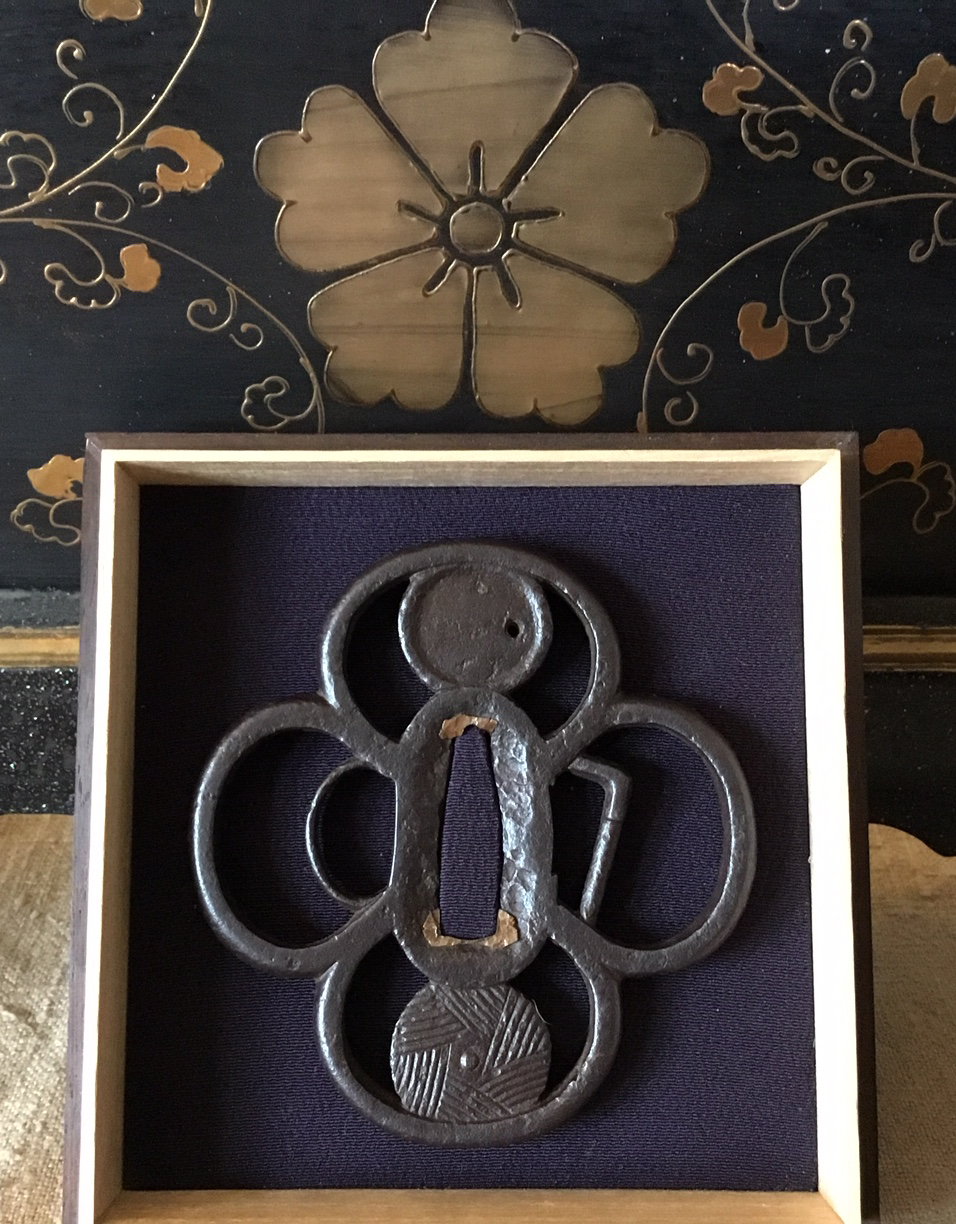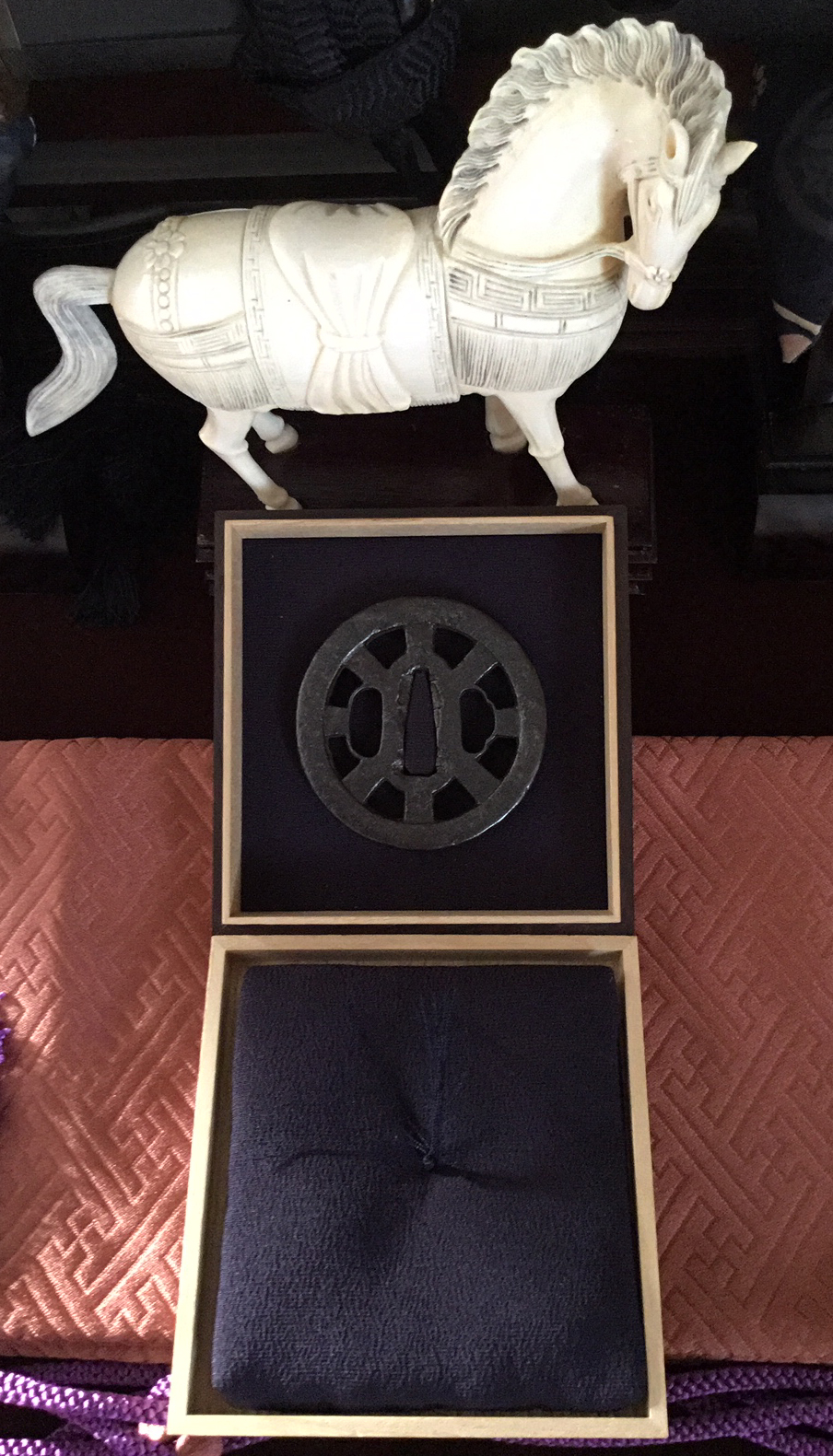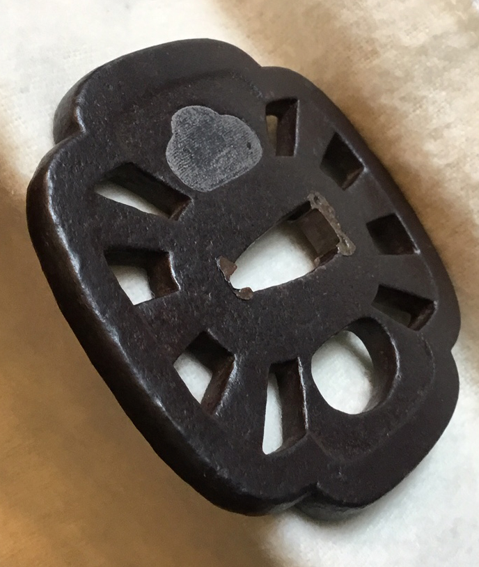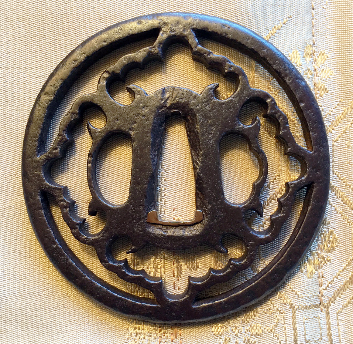 Yagyu — 'Kuruma sukashi' — Edo Period This is a convincing design with notable distinctions in the size of the wheel sukashi accommodating the hitsuana-ana and nakago-ana. Connecting the rim to the seppa-dai, are twelve spokes which form the wheel. Radial lines are visible on the wide rim edge which show wear, although they are more prominent on the reverse side and may relate to rays of the sun; an interpretation left to the viewer. The color of the iron, its thickness, the motif itself and the granular tekkotsu on the rim strongly indicate Yagyu production.