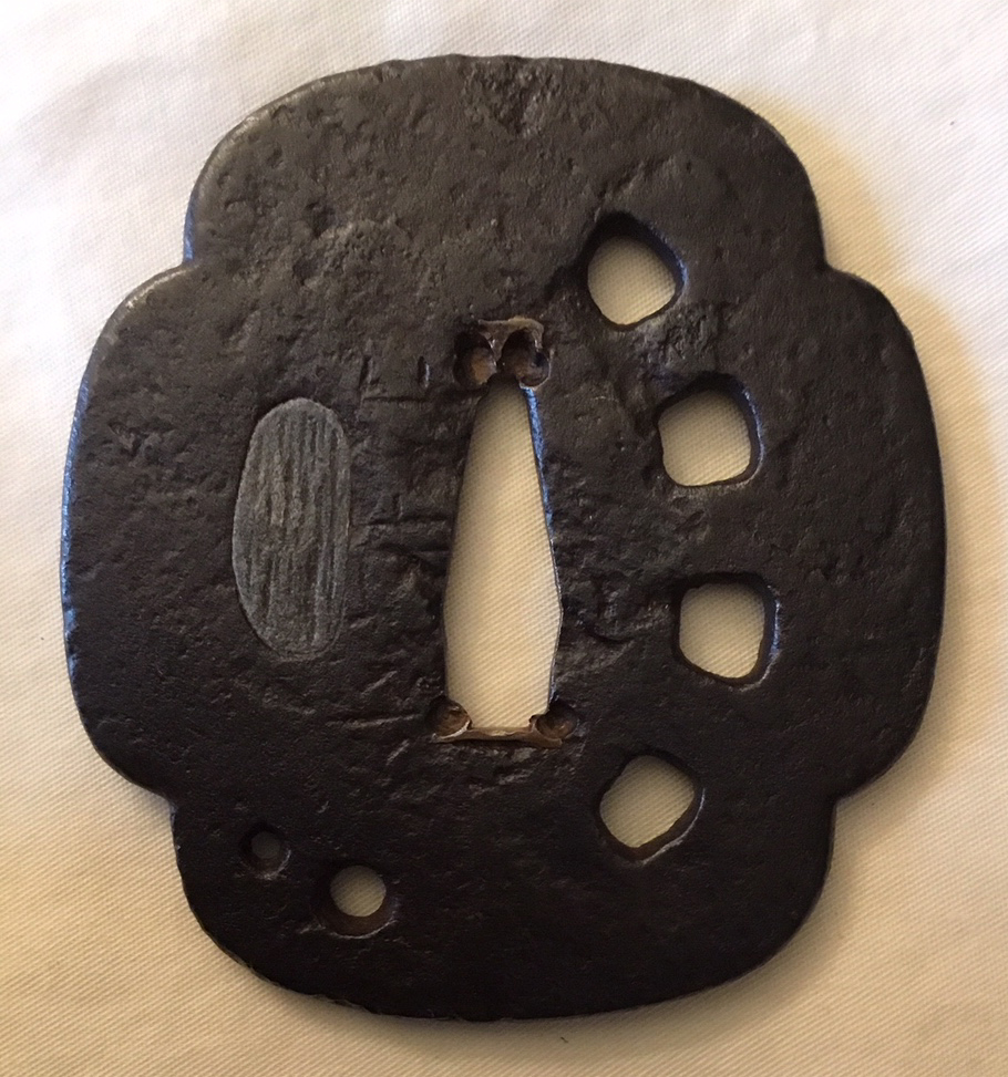H/W 8.6 x 8.0 cm — Rim 8 mm — Seppa-dai 5 mm This mokko-gata shaped tsuba is designed with 'stone grinder' sukashi, top and bottom, while the kogai-ana is formed in the shape of a lever that serves to turn the stone, a bold and symbolic design. The piece belongs in the 'Owari group' of tsuba schools by broad definition and is speculated to be of Ohno production, if not characteristically representative. The color of the iron runs to purplish black, is deep and of good quality, while the massive rim shows small granular tekkotsu on the lobes.