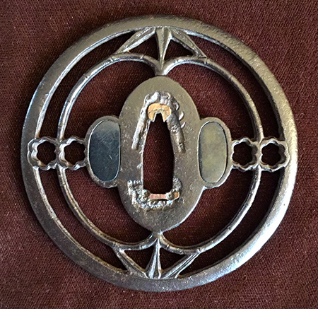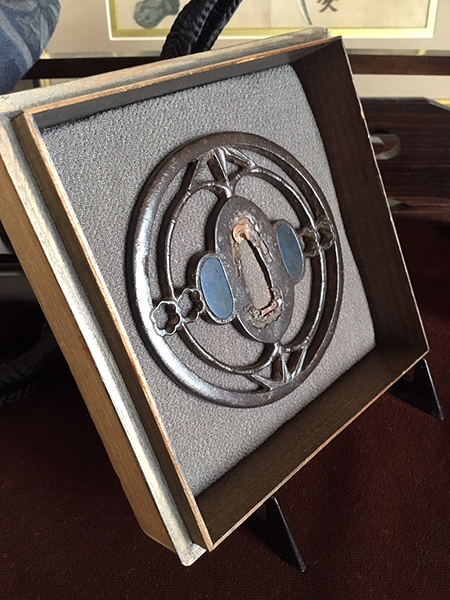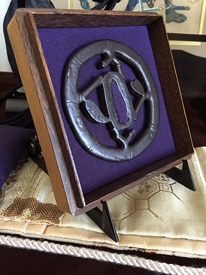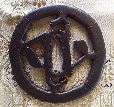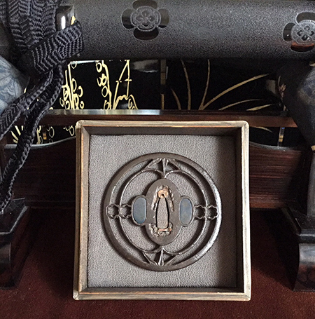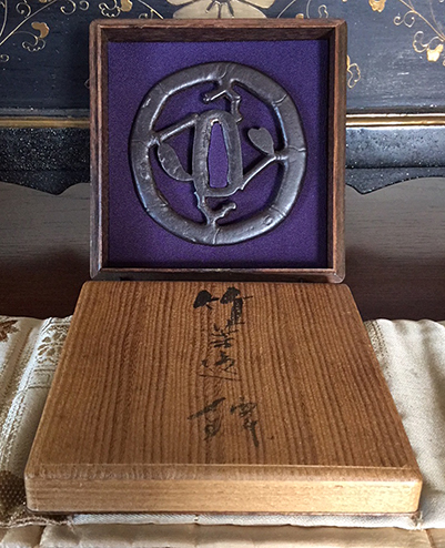 Owari – Shioridake, ‘Bamboo Stems’ design H/W 8.5 cm x 8.3 cm Rim 6 mm Seppa-dai 6mm The design on this Owari tsubaconsists of a Bamboo stem bent into circular shape which forms the tsuba’s rim, accentuated by carved ‘rings’ that represent sections of the stalk of the plant. The stem is supported by leaves and buds that connect the rim to the seppa-dai: the elements forming the hitsu-ana. The motif is described as Shioridake, a design that also appeared on tsuba produced by Matashichi, Kanshiro, and later by Kamiyoshi, with representative images of this motif depicted in works produced by two of these artists that can be found in the publication on iron tsuba from the exhibition “Kurogane no hana.” The imaged Owari is the product of early Edo production, which could extend or overlap the timeframe of the above smiths, leaving unanswered the question where or when the design may have originated. The bamboo plant stylized and incorporated into this tsuba was symbolic of strength and resilience; traits valued and held in esteem by the warrior Samurai of the era. This ‘Shioridake’ Owari tsuba is a ‘published’ piece, an image and supporting information appearing in the subject article, where the piece is described as a *‘Tsuba of great proportions and design,’ that ‘In famous tsuba class it’s famous;’ and ‘it has not been submitted for Juyo but is of Juyo level and a candidate for Juyo.’ ‘It has changed hands throughout its history and has been owned by important families.’ *Translation notes from a Japanese collector and tsuba scholar. The accompanying custom box bears a Hakogaki by Kanzan Sato whose signature is written on the cover, while the calligraphy that appears inside the lid attests to the unique quality and rarity of the piece. The tsuba itself has an extraordinary appearance and is in an excellent state of preservation, exhibiting uniform coloration and patina reflective of its age. The design elements are equally large and nicely integrated within the massive rim, its circumference slightly elongated, or ‘nagamaru-gata’ in shape, adding to the perception ‘of great proportions and design.’ Edo period – Tokubetsu Hozon NBTHK ‘Watake Setsurin Tsunagi sukashi’ H/W 8.2cm – Rim 3 mm – Seppa-dai 4 mm The design described as ‘Bamboo bridging a snow ring’ is defined by bamboo shoots at top and bottom, connecting a circular inner ring (snow) to the rim. Conceptually convincing, in looking deeper at the design we can relate to another motif formed by the inner circle itself; that is, of a sea cucumber. Commonly associated with the Early Edo period tsuba produced by famous sword duelist Miyamoto Mushashi, the sea cucumber (namako) motif nonetheless was used by Ko-Shoami smiths at least a century before and references in Sasano’s writings depict images and text describing similar pieces in his “Gold volume” Early Japanese Sword Guards. The examples illustrate tsuba with ‘Sea cucumber’ sukashi, enhanced with another motif, combining to form a design within a design, as this one appears to be. The influence from Kyo-Sukashi production, which preceded KO-SHOMAI, as well as reflected by Owari smiths that followed, are present in this example, featuring a delicately formed central motif, framed by a strong rim and supported with a characteristically large oval Seppa-Dai. The elements of this ‘Bamboo and snow ring’ sukashi are completed with the ‘ring’ joined to the seppa-dai and the rim by ‘snowflake’ shaped openings in negative silhouette. The design is compelling, almost delicate, with the balance Ko-Shoami tsuba are noted for and shows a lustrous finish and deep, dark patina. The hitsuana are ‘plugged’ with ‘Shakudo, an alloy that has a history of use with sword fittings.